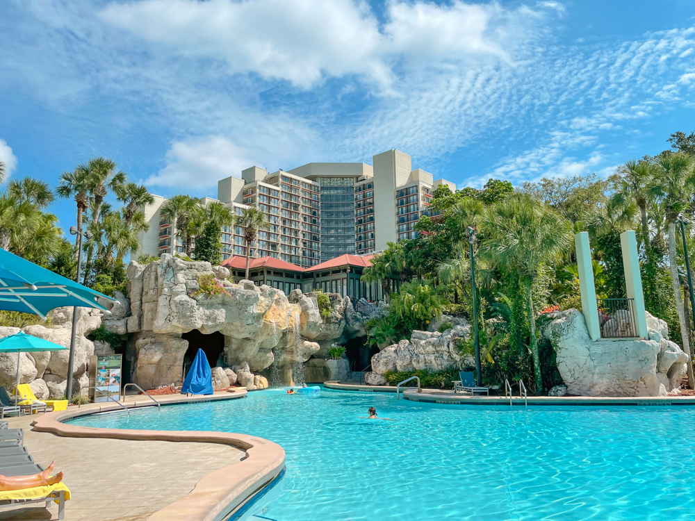 Need some restful R&R? The property offers a stunning 800,000‑gallon lagoon pool with waterfalls, a water slide, hot tubs, and a hidden grotto.